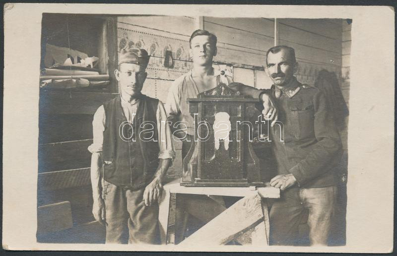 Beschreibung: 1918. augusztus 19. Sternthal-ból Zomborra küldött katonai fotólap, a hadseregben szolgáló asztalosokról és munkájukról, 9x14 cm
