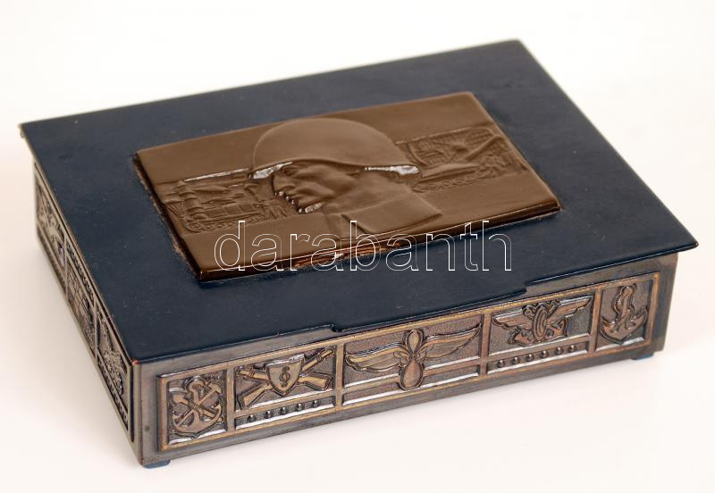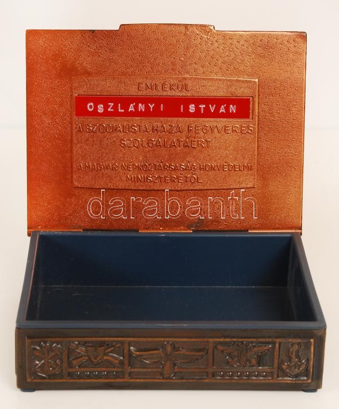 Beschreibung: "Emlékül a szocialista haza fegyveres szolgálatáért a népközt. honvédelmi miniszterétől" fém-doboz domborművel, 9×12 cm