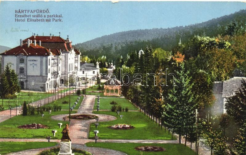 Bártfafürdő, Erzsébet szálló és park / hotel and park (vágott / cut) https://www.darabanth.com/de/218-Fernauktion/218.0/Ansichtskarten/Slowakei~400007/Bartfafurdo-Erzsebet-szallo-es-park-hotel-and-park-vagott-cut~II925918