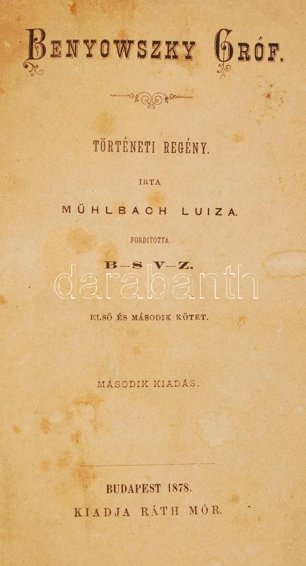 Mühlbach Luiza: Benyowszky Gróf. Történeti regény. Első és második kötet. Második kiadás. Bp., 1878, Ráth Mór. Félvászon kötés, 2. kötet címlapja hiányzik, kopottas állapotban.