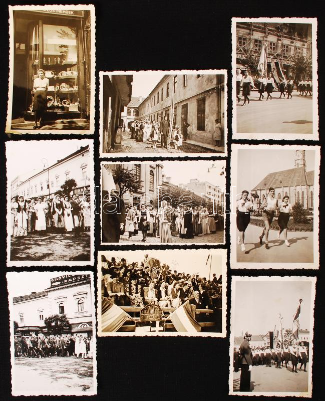 Beschreibung: 1941-1942 Ünnepség és felvonulás Kolozsváron, 9 db fotó, hátoldalon feliratozva, 9x6 cm