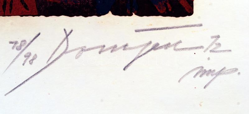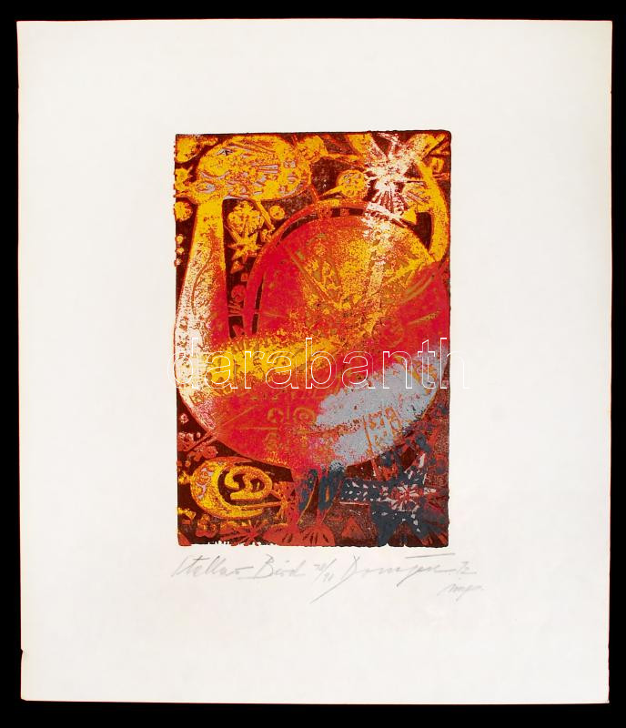 Beschreibung: Domján József (1907-1992): Stellar bird. Színezett fametszet, papír, jelzett, 36×24 cm