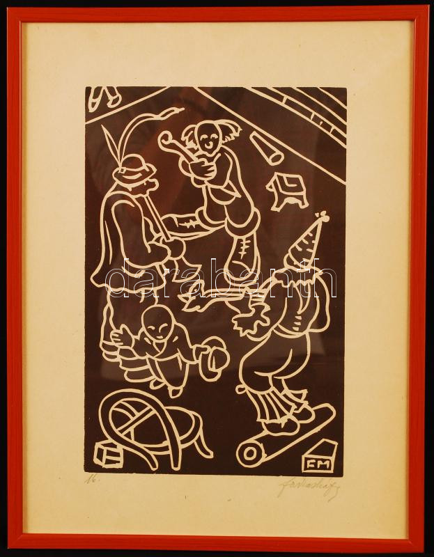 Farkasházy Miklós (1895-1964): Zenebohócok. Linó, papír, jelzett, üveg... https://www.darabanth.com/de/219-Fernauktion/219.0/Andere-Sammelgebiete/Gemalde-und-Grafiken~500001/Farkashazy-Miklos-1895-1964-Zenebohocok-Lino-papir-jelzett-uvegezett-keretben-30C39720-c~II931447