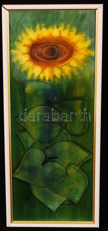 Beschreibung: Macskássy Izolda (1945-): napraforgó. Vegyes technika, selyem kartonra kasírozva, üvegezett keretben, 49×18 cm