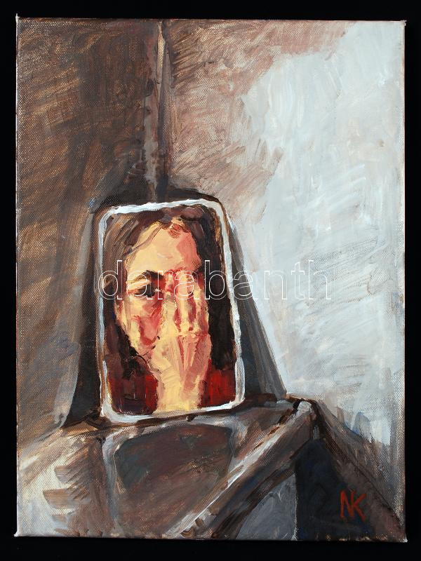 Beschreibung: Németh Krisztina (1994-): Sarokba állítva. Olaj, vászon, jelzett, 40×30 cm