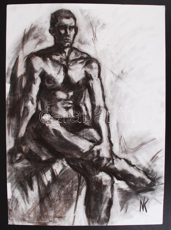 Beschreibung: Németh Krisztina (1994-): Ülő férfi. Tanulmányrajz. Szén, papír, jelzett, 69×50 cm