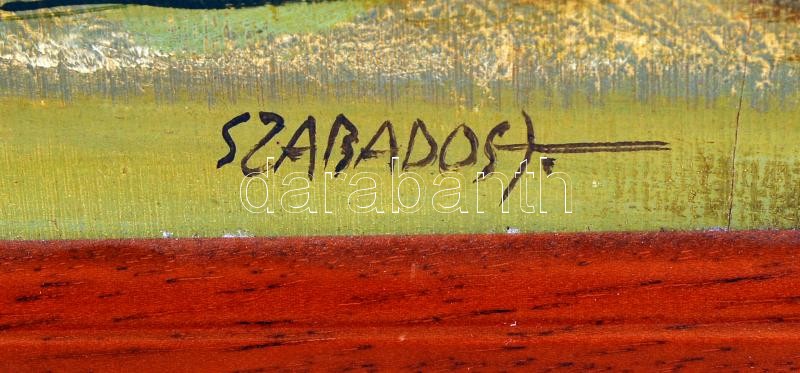 Beschreibung: Szabados János (1937-): Kopár vidék. Olaj, farost jelzett, sérült keretben, 50×70 cm