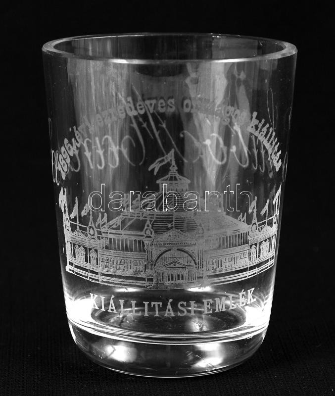 Beschreibung: "1896. évi ezredéves országos kiállítás kiállítási emlék" feliratú gravírozott üvegpohár, apró hibával, m: 9 cm, d: 7 cm