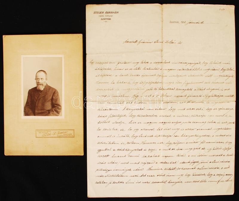 cca 1910 Steuer Ábrahám (1871-194?) szatmári főrabbi fotója, 8,5×6 cm; valamint levele fiaihoz 1912 januárjából /