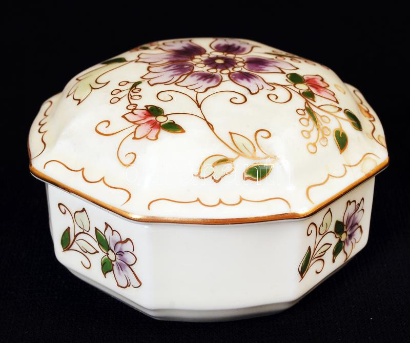 Beschreibung: Zsolnay virágmintás nyolcszögletű bonbonier, kézzel festett, hibátlan, jelzett, d: 9 cm