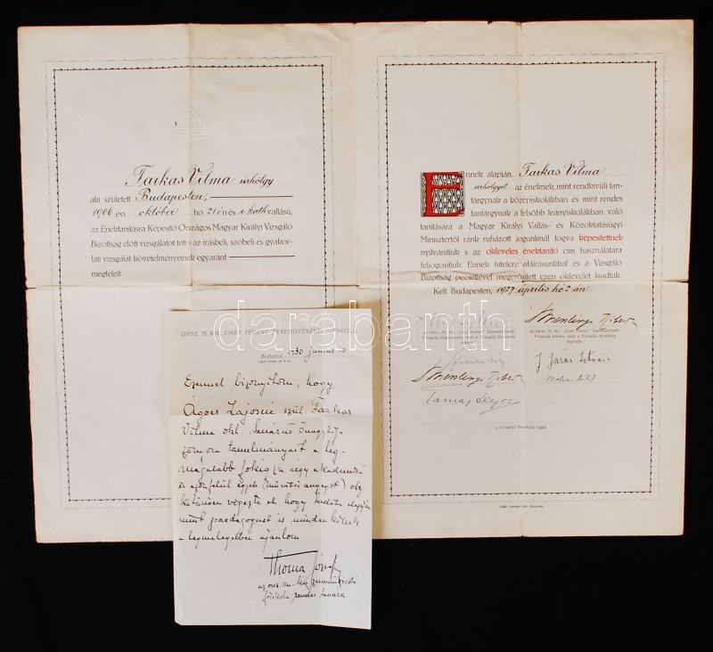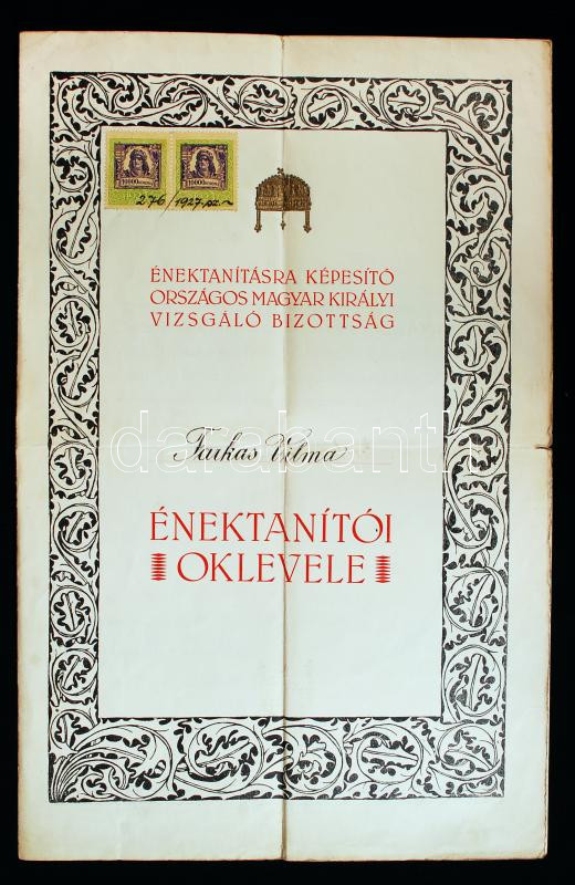 1927 Hubay Jenő (1858-1937) zeneszerző, hegedűművész, Meszlényi Róbert (1883-1946) zeneszerző, Szabados Béla (1867-1936) zeneszerző és mások aláírása díszes énektanítói oklevélen.