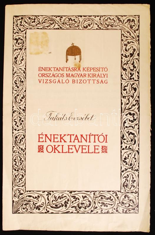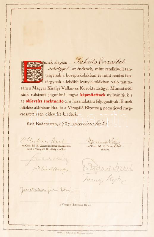 Beschreibung: 1927 Hubay Jenő (1858-1937) zeneszerző, hegedűművész, Moravcsik Géza (1855-1929) zenetanár és mások aláírása díszes énektanítói oklevélen.