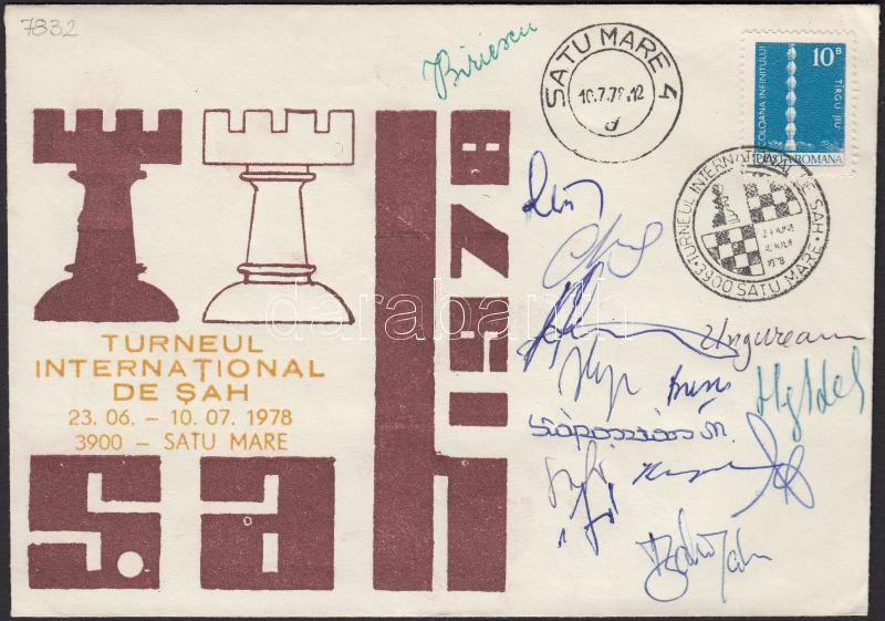 1978 A Szatmárnémeti nemzetközi sakk verseny résztvevő versenyzőinek aláírása alkalmi borítékon / Satu Mare international chess contest participants signature on special envelope