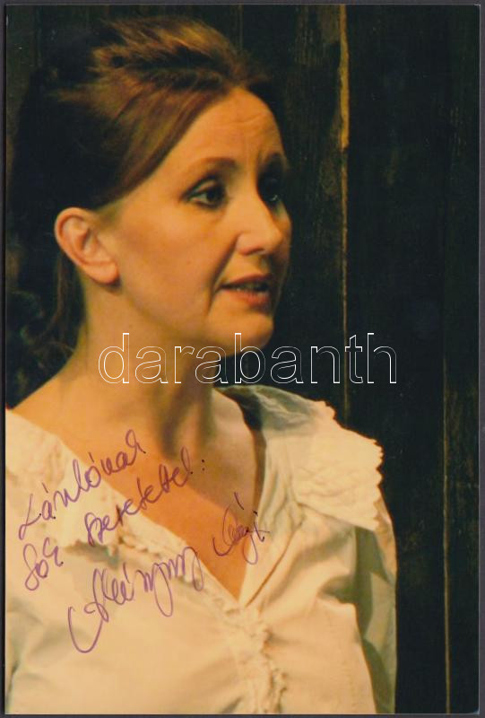 Beschreibung: Kökényessy Ági (1967–) magyar színésznő, szinkronszínésznő aláírása az őt ábrázoló fotón