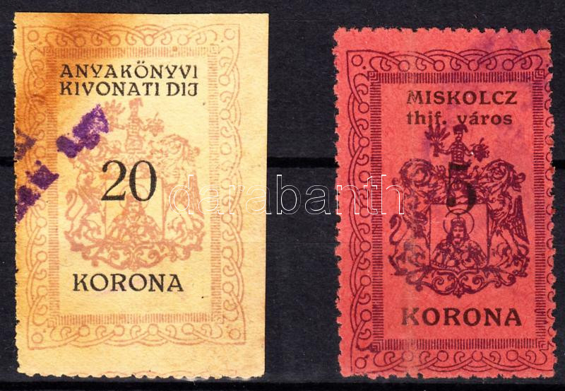 1921 Miskolc városi illetékbélyeg 20K, 5K https://www.darabanth.com/de/219-Fernauktion/219.0/Andere-Sammelgebiete/Stempelmarken~500026/1921-Miskolc-varosi-illetekbelyeg-20K-5K~II939431