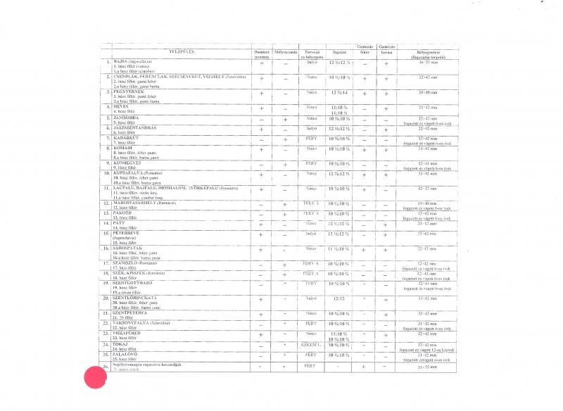 Beschreibung: 1944 Közigazgatási Vöröskereszt bélyegek táblázata: A4-es színes fénymásolat, hátoldalán táblázatban szedett információkkal (tervező, méret, nyomdatechnika stb.)