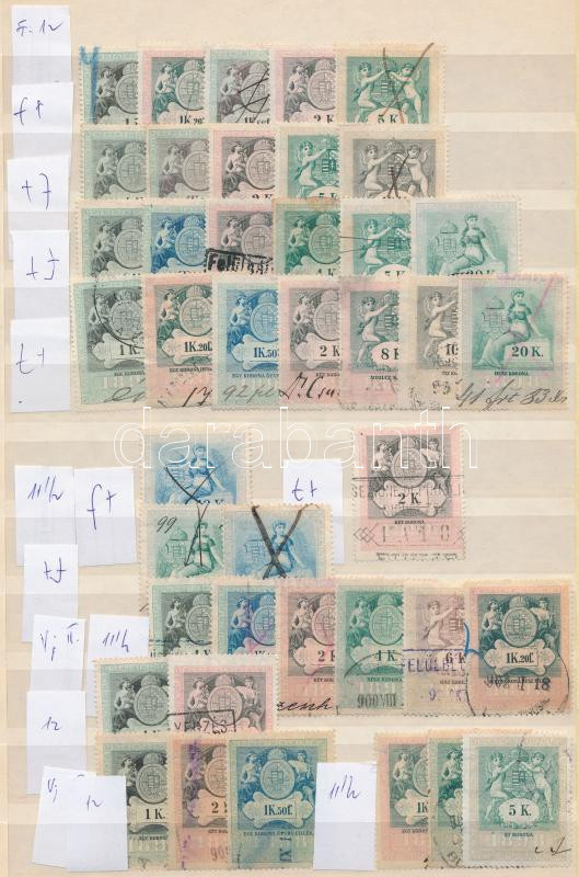41 db régi okmánybélyeg vízjel és fogazat variációkkal, berakólapon https://www.darabanth.com/de/219-Fernauktion/219.0/Andere-Sammelgebiete/Stempelmarken~500026/41-db-regi-okmanybelyeg-vizjel-es-fogazat-variaciokkal-berakolapon~II930855