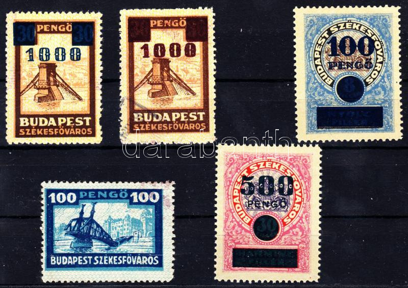 Beschreibung: Budapest Székesfőváros 5 db bélyeg felülnyomásokkal, közte 2 db postatiszta