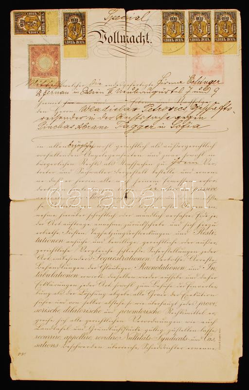 cca 1890 Okmány osztrák-bolgár vegyes okmánybélyegzéssel / Document st... https://www.darabanth.com/de/219-Fernauktion/219.0/Andere-Sammelgebiete/Stempelmarken~500026/cca-1890-Okmany-osztrak-bolgar-vegyes-okmanybelyegzessel-Document-stamps-Austrian-Bulgarian-~II940476