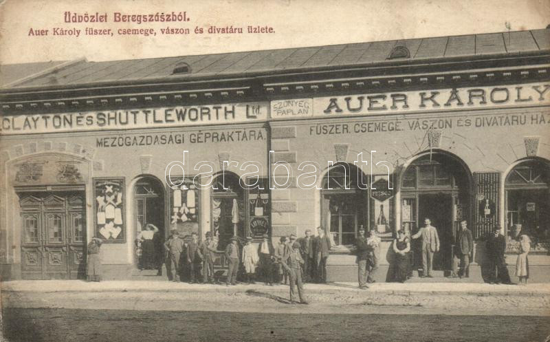 Beregszász, Auer Károly fűszer, csemege, vászon és divatáru üzlete, Clayton és Shuttleworth Ltd. mezőgazdasági gépraktára / shop, machine storehouse (fl)