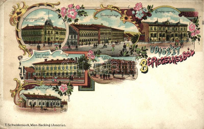 Beregszász, Pénzügyigazgatóság, állami polgári leányiskola, Hitelintézet, Vármegyeház, Termény csarnok / Financial palace, girl school, bank, county hall, shop, floral Art Nouveau litho (EK)