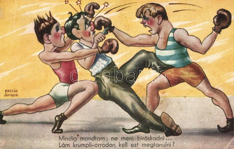 1961 Boxing boys, humour NM 407/12. s: Kaszás Jámbor (EK) https://www.darabanth.com/de/219-Fernauktion/219.0/Ansichtskarten/Sport~500115/1961-Boxing-boys-humour-NM-40712-s-Kaszas-Jambor-EK~II936806
