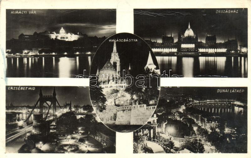 Budapest, Királyi vár, Halászbástya, Erzsébet híd, Országház este (fa) https://www.darabanth.com/de/219-Fernauktion/219.0/Ansichtskarten/Ungarn~300005/Budapest-Kiralyi-var-Halaszbastya-Erzsebet-hid-Orszaghaz-este-fa~II939906