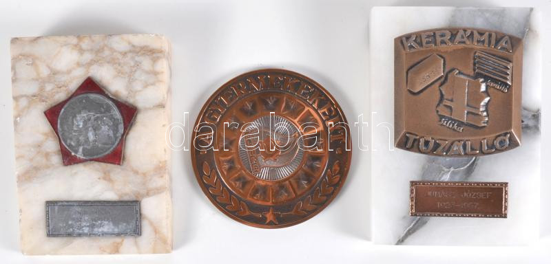 Beschreibung: 3 vegyes plakett: "Tűzálló kerámia", "A gyermekekért - Előre", "Lőverseny", kettő dísztokban T:vegyes