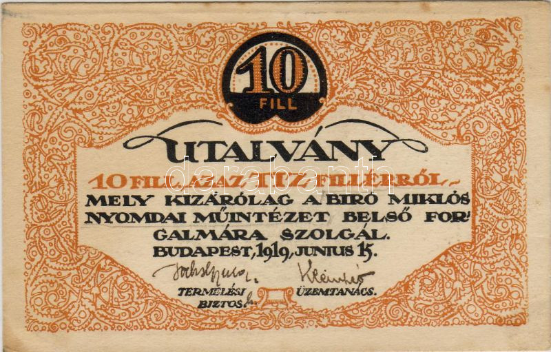 1919 "Biró Miklós..." 10f szükségpénz T:I https://www.darabanth.com/de/22-Fernauktion/22.0/Numismatik/~167/1919-Biro-Miklos-10f-szuksegpenz-TI~II39277