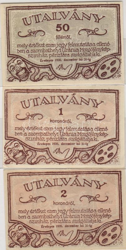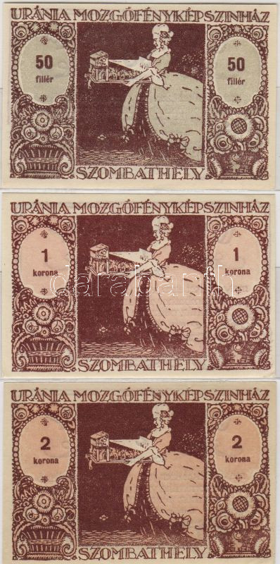 Beschreibung: 1921 "Uránia..." 50f, 1K, 2K, szükségpénz 3db T:I