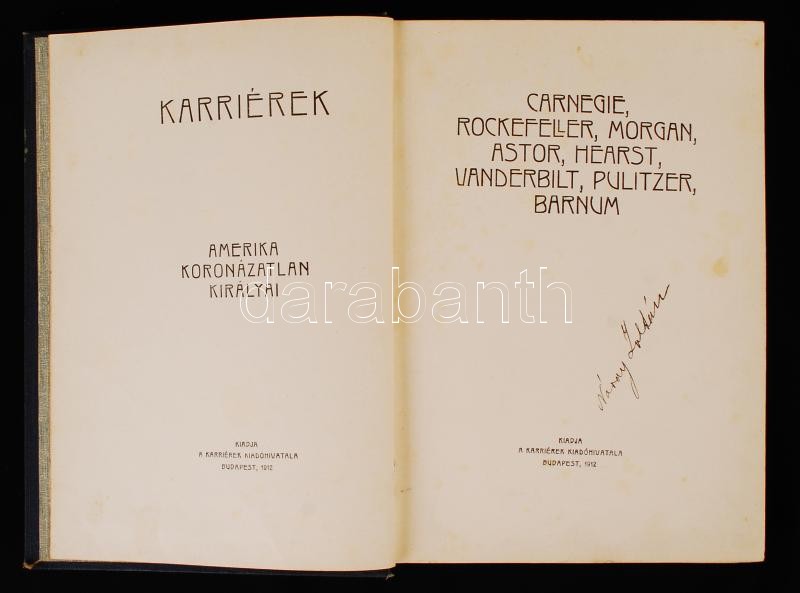 Amerika koronázatlan királyai: Carnegie, Rockefeller, Morgan, Astor, Hearst, Vanderbilt, Pulitzer, Barnum. Bp., 1912, Karriérek Kiadóhivatala (Karriérek). Tulajdonosi bejegyzéssel. Kicsit laza, kicsit kopott aranyozott vászonkötésben, egyébként jó állapotban.
