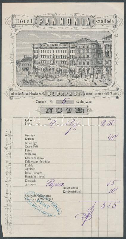 Beschreibung: 1874 Bp., VIII. Hotel Pannonia szálloda által kiállított fejléces számla a szálloda bélyegzőjével, hátoldalán kézírással.