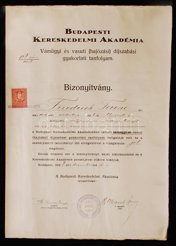 1928 Bp., A Budapesti Kereskedelmi Akadémia Vámügyi és vasúti (hajózási) díjszabási gyakorlati tanfolyamának sikeres elvégzéséről szóló bizonyítvány okmánybélyeggel