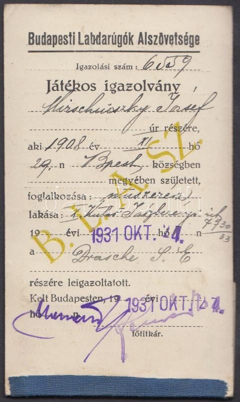 1931 a Budapesti Labdarúgók Alszövetsége igazolványa, fényképpel, a Dr... https://www.darabanth.com/de/220-Fernauktion/220.0/Andere-Sammelgebiete/Dokument~10002/1931-a-Budapesti-Labdarugok-Alszovetsege-igazolvanya-fenykeppel-a-Drasche-Gyarak-Sportegye~II945966