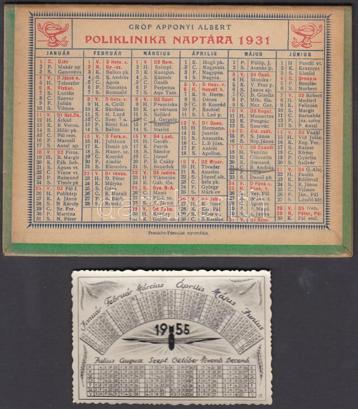 1931-1955 2 db kártyanaptár-Gróf Apponyi Albert Poliklinika naptára, f... https://www.darabanth.com/de/220-Fernauktion/220.0/Andere-Sammelgebiete/Drucksachen~10038/1931-1955-2-db-kartyanaptar-Grof-Apponyi-Albert-Poliklinika-naptara-fotoeljarassal-keszult~II944806