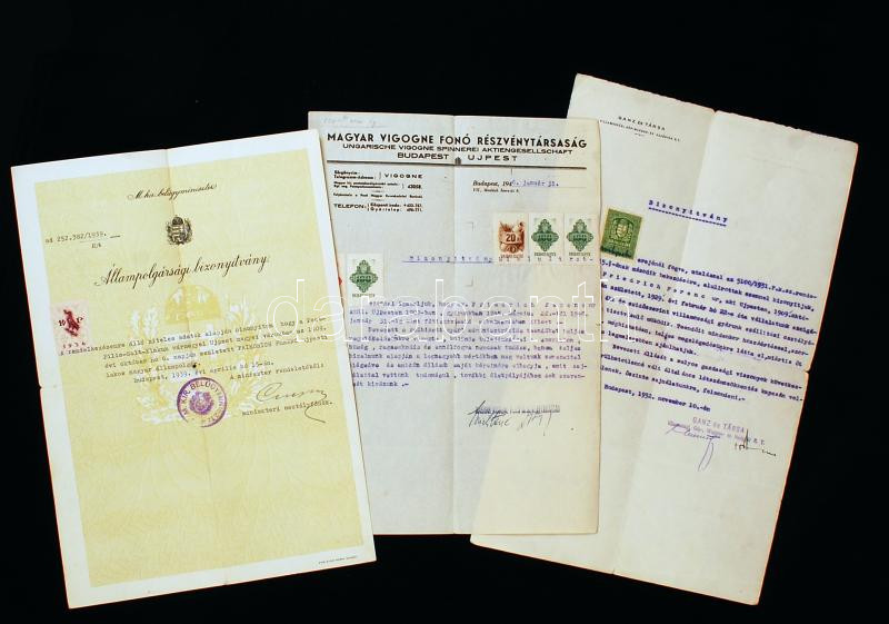 Beschreibung: 1932 Újpesti lakos iratai, állampolgársági bizonyítványa, 2 db munkával kapcsolatos bizonyítvány okmánybéylegekkel