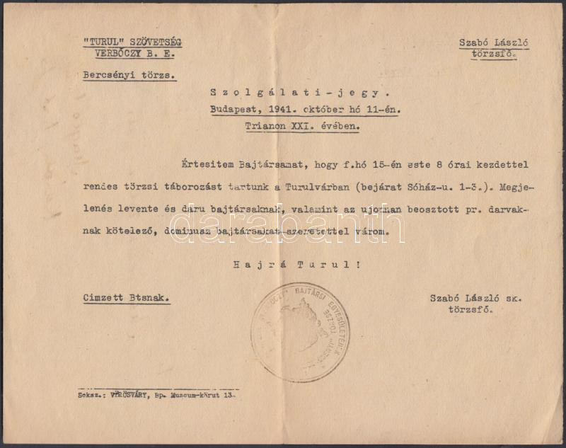 1941 Bp., A Turul Szövetség Verbőczy B.E. Bercsényi törzsének szolgála... https://www.darabanth.com/de/220-Fernauktion/220.0/Andere-Sammelgebiete/Drucksachen~10038/1941-Bp-A-Turul-Szovetseg-Verboczy-BE-Bercsenyi-torzsenek-szolgalati-jegye~II945897