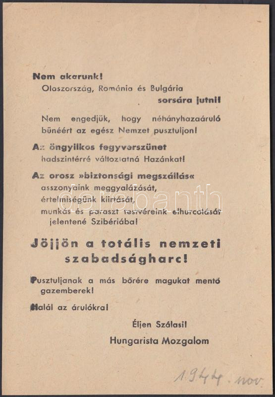 1944 "Jöjjön a totális nemzeti szabadságharc!" A Hungarista Mozgalom r... https://www.darabanth.com/de/220-Fernauktion/220.0/Andere-Sammelgebiete/Drucksachen~10038/1944-Jojjon-a-totalis-nemzeti-szabadsagharc-A-Hungarista-Mozgalom-roplapja~II943791