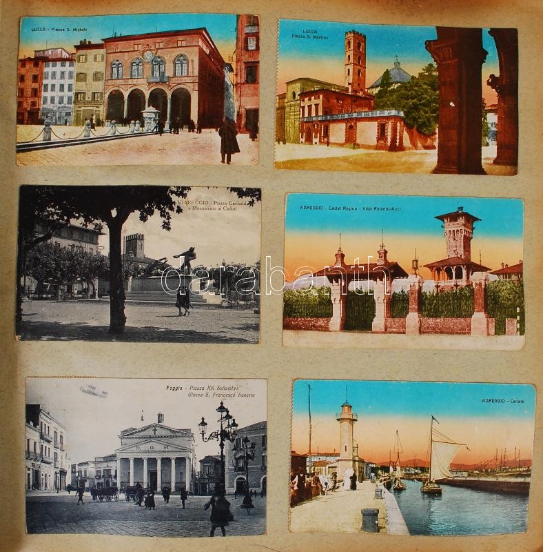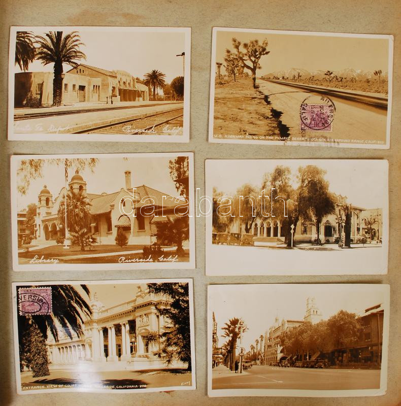 cca 1930-1960 Egy világutazó emlékei. Nagy album tele beragasztott képeslapokkal az egész világból. Európa, Amerika, Távol-Kelet. Gyakori és ritkább lapok, összesen kb 400 db + néhány családi fotó, közte érdekesebbek is. / Large collection of a world traveller. About 400 glued in postcards of cities of Europe, America and Far-East.