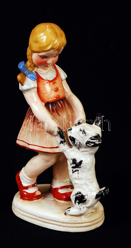 Beschreibung: Kislány kutyával, kézzel festett kerámia figura hajszálrepedésekkel, jelzett, m: 18 cm
