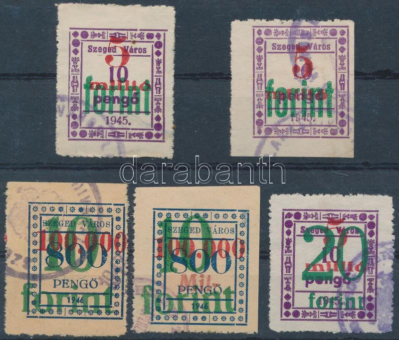 Beschreibung: 1946-1948 5 db Szeged városi illetékbélyeg felülnyomással, közte keskeny 5-ös