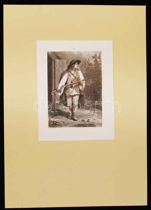 Barabás Miklós (1810-1898) rajza alapján metszette Carl Mahlknecht (1810-1893). Vadász. Acélmetszet. Jelezve a lenyomaton. Kép méret: 11x8cm. Pasztpartuban.