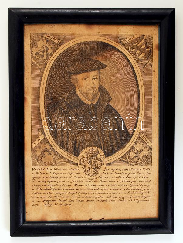 II. Vitus (Veit) von Würtzburg (†1577) bambergi herceg-püspök arcképe, körülötte a Birba, Redwitz, Thann és Würtzburg frankóniai nemesi családok címereivel, alatta rövid latin nyelvű életrajzzal. Johann Salver (1670-1738) rézmetszete, papír, jelzett, modern keretben, 30,5×22 cm /