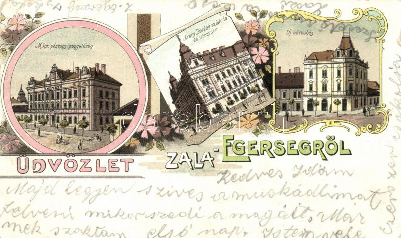 1899 Zalaegerszeg, Pénzügyigazgatóság, Arany Bárány szálloda, utca, Új... https://www.darabanth.com/de/220-Fernauktion/220.0/Ansichtskarten/Ungarn~30006/1899-Zalaegerszeg-Penzugyigazgatosag-Arany-Barany-szalloda-utca-Uj-Varoshaza-floral-A~II943733