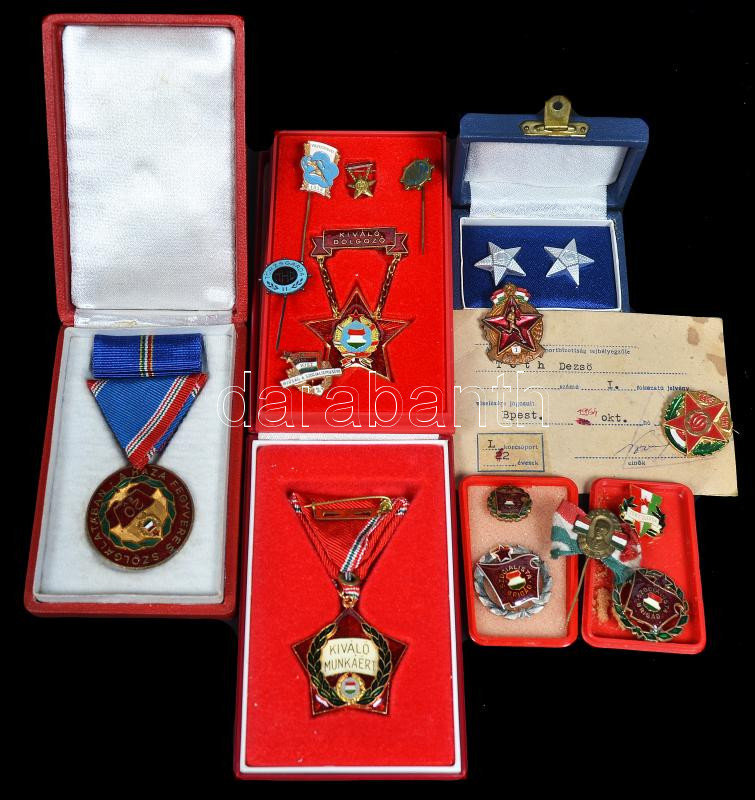 Beschreibung: Doboznyi vegyes szocialista jelvény, kitüntetés, több dÃsztokban, közte "Kiváló dolgozó", "Szocialista Brigád", "A haza fegyveres szogálatában", "Kiváló munkáért" stb. T:vegyes