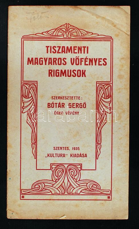 Bótár Ernő: Tiszamenti magyaros vőfélyes rigmusok. Szentes, 1935. Kult... https://www.darabanth.com/de/221-Fernauktion/221.0/Andere-Sammelgebiete/Bucher-Reisen-Stadte~1600013/Botar-Erno-Tiszamenti-magyaros-vofelyes-rigmusok-Szentes-1935-Kultura-16p~II955697
