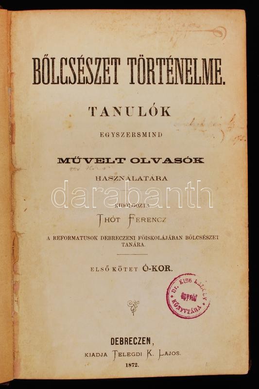 Beschreibung: Thót Ferencz: Bölcsészet történelme. Tanulók egyszersmind művelt olvasók használatára. Első kötet Ó-kor. Debreczen, 1872, Telegdy K. Lajos.