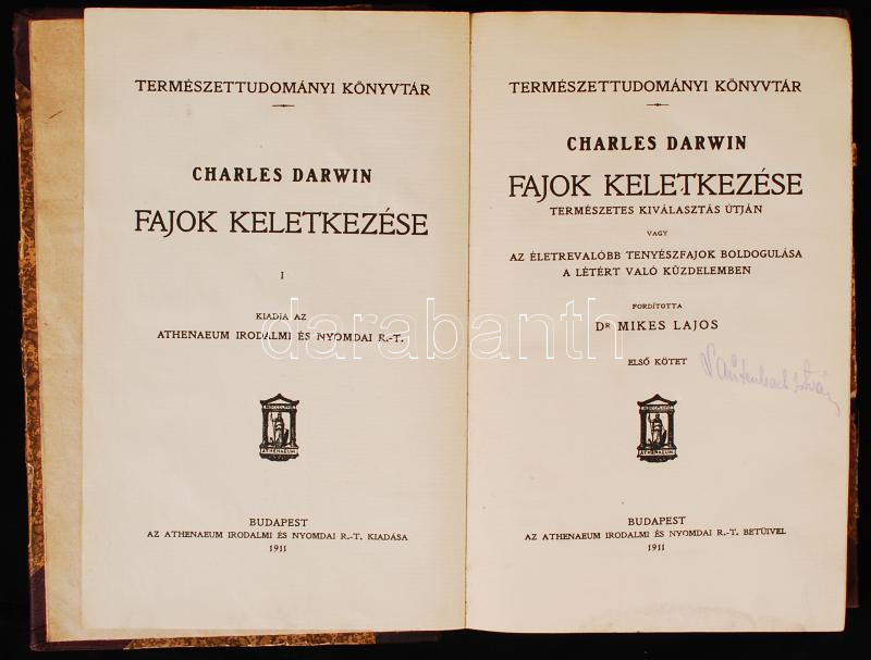Darwin, Charles: Fajok keletkezése természetes kiválasztás útján vagy az életrevalóbb tenyészfajok boldogulása a létért való küzdelemben I-II. kötet. Fordította dr Mikes Lajos. Bp., 1911, Athenaeum. Félvászon kötés, festett lapszélek, kopottas állapotban.