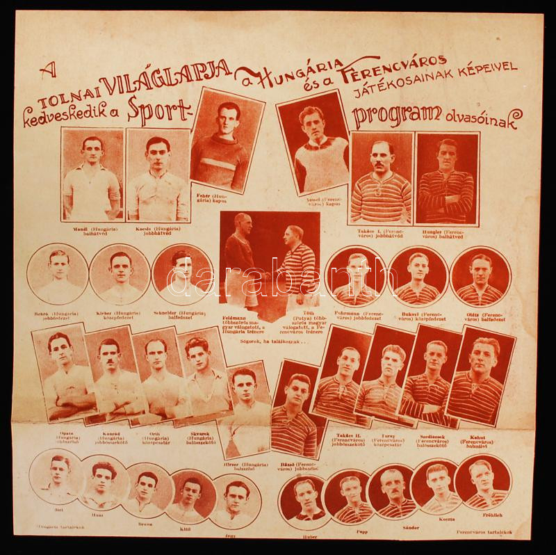 Hungária és Ferencváros játékosainak képei a Tolnai Világlapja mellékl... https://www.darabanth.com/de/221-Fernauktion/221.0/Andere-Sammelgebiete/Drucksachen~1600009/Hungaria-es-Ferencvaros-jatekosainak-kepei-a-Tolnai-Vilaglapja-melleklete-hatoldalon-korab~II950224
