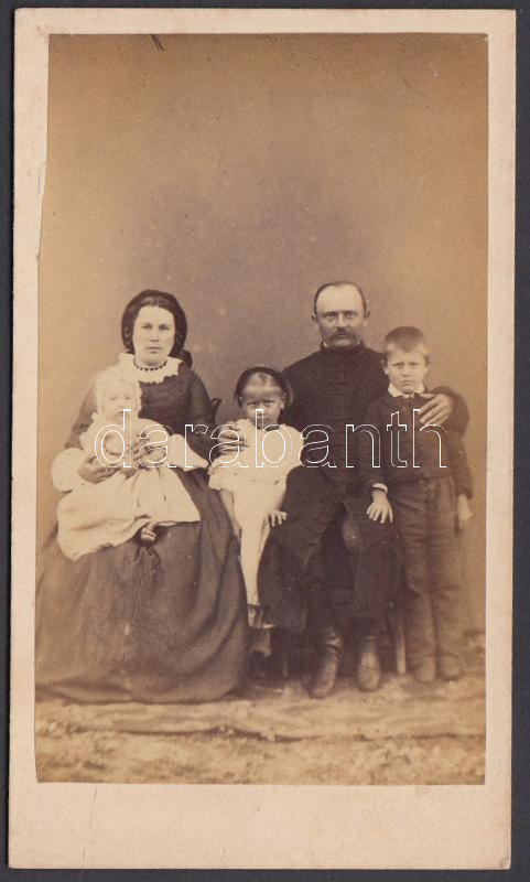 Beschreibung: 1865. július 5. Kovács József református lelkész (Somogy megye, Görgeteg) és családja, feliratozott vizitkártya méretű fénykép, 10,5x6 cm